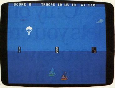 Sailboats glide over the water while the plane passes overhead in the VIC-20 version of "Paratrooper."