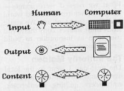 Content is the purpose of the computer activity—the management of text, the computation of spreadsheets, or the creation of graphic images, to name just a few. Although input flows from the user to the computer, and output goes from the computer to the user, the communication of content is purely inferential. In other words, the user has an internal model of what the computer program is doing, or how it is doing its task. To use a program successfully, it's not important if the user's model of what is happening is accurate. All that's important is if the model is consistent with the program's behavior.