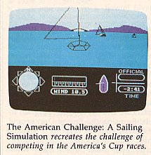 The pleasures of sailboat racing are effectively recreated in The American Challenge: A Sailing Simulation from Mindscape and Tom Snyder Productions. Fashioned after the America's Cup races, the goal of the game is to win all the preliminary heats. This, in turn, gains you the right to challenge the Australians in an attempt to regain the Cup for the United States. Should you manage to beat Australia in the program's Cup Race, you become eligible for a contest that could win you a trip to Australia to watch the 1987 America's Cup races in person (the contest closes on October 30, 1986).