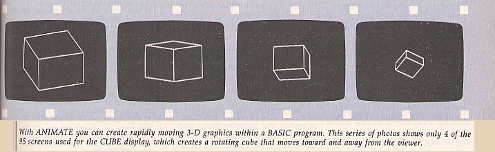 Full-screen animation is achieved by rapidly displaying a series of high-resolution screens on the video display. Producing realistic animation using BASIC is very difficult because of the time required to create the screen images. The creation of a high-resolution screen image usually consists of two processes repeated many times. First, the coordinates of the endpoints of a line segment are computed. Second, the line segment is displayed on the screen.