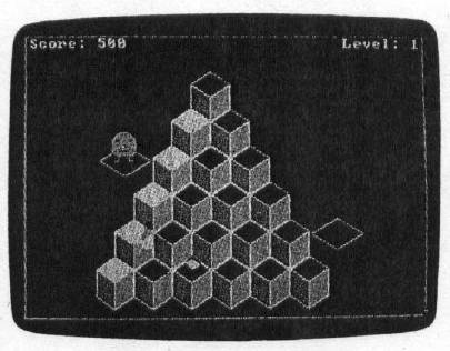 Your pursuers consist of a bouncing rock and a pesky buglike creature. The rock comes bouncing down randomly from the top of the screen, starting over again every time it reaches the bottom of the pyramid. The creature is a little smarter. It constantly follows your every move as you jump from cube to cube. If your player collides with either one, the game ends.