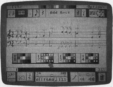 Since the Amiga allows you to play four different parts simultaneously, the color-coded notes help you to distinguish clearly among the four tracks being played. Lyrics can also be inserted within the score.