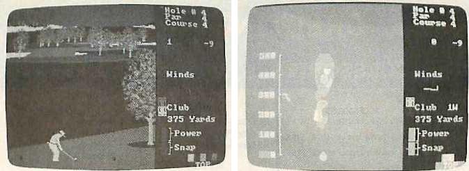 The golf course terrain imagery is extremely well done, with a variety of hazards, including trees, sand traps, and waterways. Beautiful background scenes enhance the view, ranging from carnival grounds and hanging bridges in the near distance to remote mountains topped with summer clouds. The TOP control may be used to switch between the golfer's view of the course and a map showing the overall layout of the hole and the current position of the active player's ball. Four different 18-hole layouts provide sufficient variety to generate many hours of golfing enjoyment.