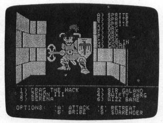 Of course, magic and combat do occur, as you want and expect them to do. But the tremendous range of monsters and magic in this game give it a freshness that sets it apart from other fantasy games. Two hundred different monsters may be encountered, each with its own set of statistics, including ratings for special attacks, magic resistance, friendliness, spell-casting abilities, missile weapons, aggressiveness, and more. Many of the more powerful monsters can regenerate. There's nothing more frustrating than scoring a major hit upon a demon, only to have it return to its initial state.