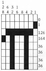 Start out by designing your characters. Fill in the blocks on an 8×8 grid; each block will represent a pixel (picture element, dot). Observe the "A" in figure one. Notice the heavy vertical lines. A television screen will display horizontal lines brighter than vertical lines, so it is necessary to have two vertical lines in order for it to be clearly visible. Therefore, the "pi" in figure two may be hard to see unless enlarged in grapics mode 1 or 2.