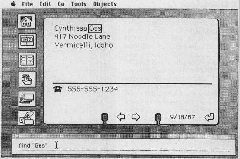 The central figure in this image looks like a RolodexTM card containing a name-and-address field and a phone-number field. This particular card was picked from the stack by using a "find" command issued in the message box at the bottom of the screen. By clicking the mouse on the telephone-shaped button, the phone number is dialed automatically. The buttons to the left of the card image launch other applications and provide other capabilities such as sorting the stack alphabetically. The entire operation of this stack, including the creation of new entries, is based on the fundamental Macintosh model of "type and click."