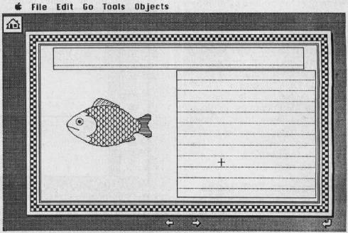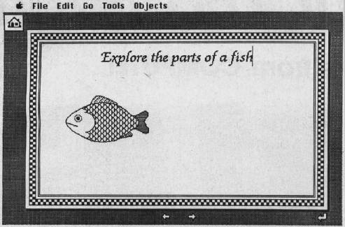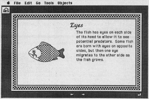 Buttons can be used to perform myriad operations. Their most common use is to branch to another card or to another stack. They can even be used to launch other applications that have nothing to do with HyperCard, such as starting a word processing program. To get a feel for how easy it is to become a HyperCard author, I've created a small stack designed to let people explore the different parts of a fish. As the user clicks on different areas of a fish, the program displays the name of the area being touched and presents a brief description to the user.