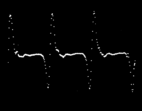 In Figure 4 we show a photograph of the results of sampling a 1000 Hz sine wave at a rate of about 25,000 Hz. The photograph shows 256 points on the sine wave. Since we did not have a camera for our oscilloscope, the pictures were taken through a Celestron 5” telescope, placed about 25 ft. from the oscilloscope. Figure 5 shows the scope trace expanded to show just one cycle of the same waveform in Figure 4. Figure 6 shows 256 points of a 100 Hz sine wave sampled about once every 40 microseconds, while Figure 7 shows 256 points on a 10 Hz sine wave sampled once every 2000 microseconds. Figure 8 is the waveform of the A string of an electric guitar just after being plucked. The sampling rate in this case was about one sample every 85 microseconds. Finally, in Figure 9 we show a sampled version of a 2500 Hz sine wave. Clearly the system still does a pretty good job of reconstructing a 2500 Hz sine wave, but the information in frequencies much above 5000 Hz will be lost. Hopefully these pictures are worth a thousand words.