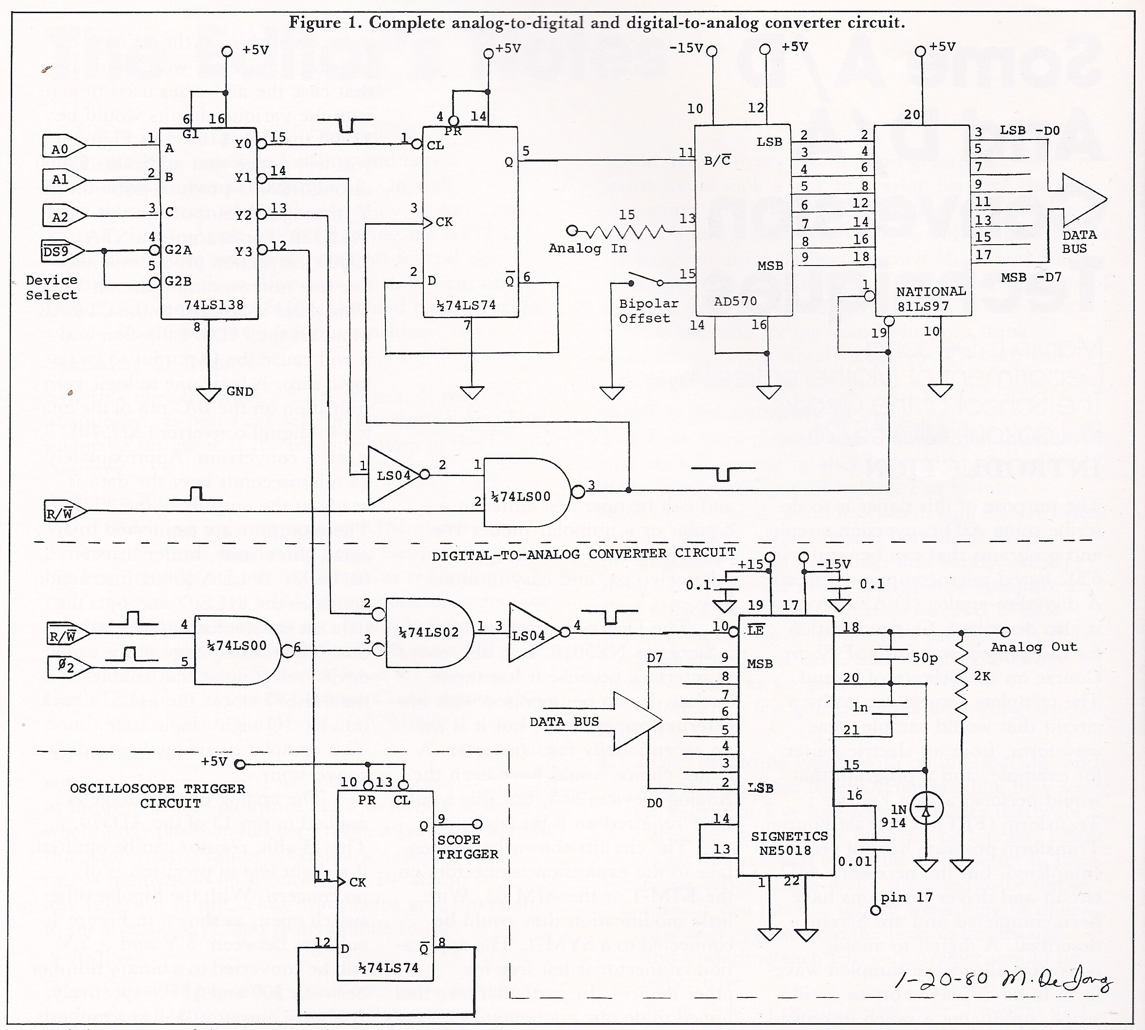 The circuits of Figures 1 - 3 provide a complete A/D and D/A system that can be used for a large variety of applications including voltage measurements, temperature measurements, and the storage scope application described here.