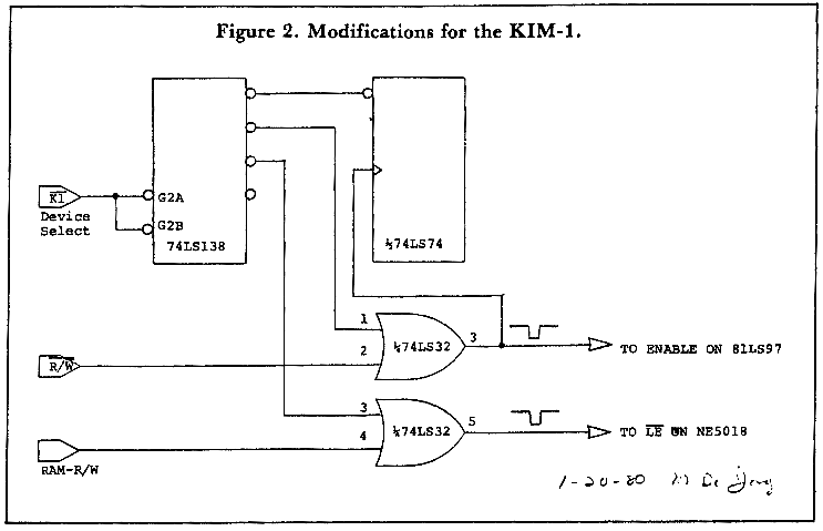 For all you purists who think that if it can't be done with a KIM-1 then it isn't worth doing, the circuit in Figure 1 will also work with a KIM-1. We simply replaced the DS9 device select with the Kl de­vice select produced by the on­board 74145. A 3.3k pullup resistor is required. The entire circuit can be simplified somewhat with the modifications shown in Figure 2. The various 04s, 02s, and 00s are replaced with two gates on a 74LS32, the Kl device select goes to the 74LS138, and the remainder of the circuit is the same as in Figure 1. The RAM-RW signal on the KIM-1, which does not have the same meaning on the AIM 65, can be used to simplify the logic, as shown in Figure 2. The same simplification could probably be used with the SYM-1.