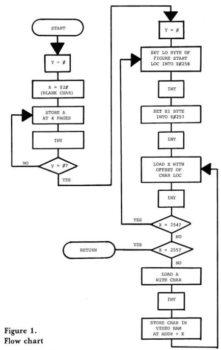 Looking at the flow chart (Figure 1), you can see that the first data loaded is the lo byte, then the hi byte, of the screen location. This information is in the table for this particular game, and is deposited within the program to give a start location on the screen for the first graphics figure. Next, the offset of the first character is loaded into the X register, and a check is made to see if the figure is ended. I have selected $FE (254) as a signal that part of the figure is completed, and $FF (255) for the end of the routine. If this data is neither, a graphics symbol will be leaded into the accumulator. This symbol is then deposited into the video refresh memory at the location previously loaded plus the offset in the X register. This may all sound a bit complicated, but that doesn't make any difference to you, the programmer. The program will take care of itself if the proper data is presented from the symbol table in the correct sequence.