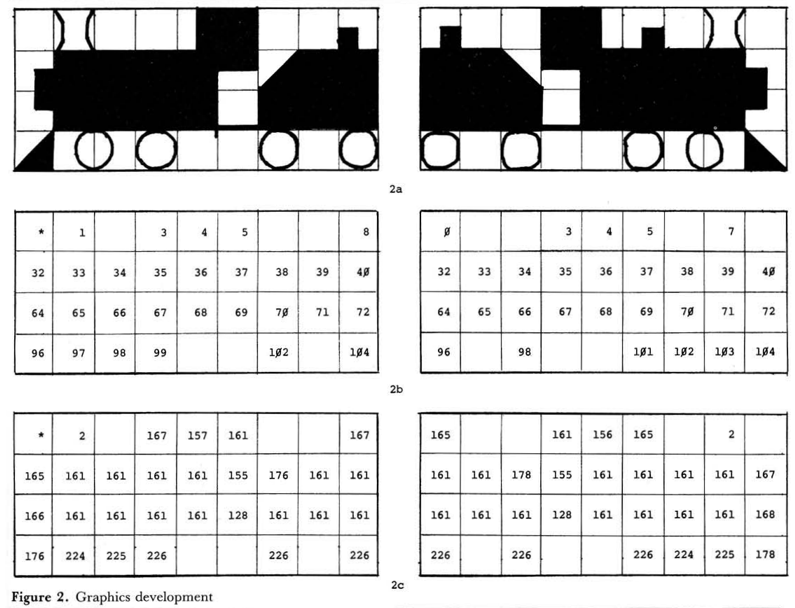 2. In an equivalent number of spaces, enter the offsets of the screen address, starting at a point above and to the left of the figures. If the number of the offset exceeds 253, just split the figure into two or more parts and treat each as a separate entity. They can be recombined in the BASIC program.