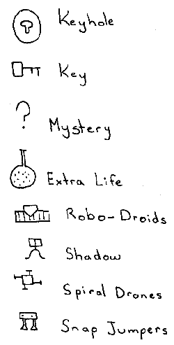 There are four different levels in the game and to get to each level you must open different doors with the keys you find. Each key is a different color to match the different colored keyholes. Besides having four different levels in the lair there are four different skill levels. They range from Novice to Expert, where novice being fairly slow moving and few drones, and expert moving extremely fast and many drones. Once you leave a room and then return back into the same room there will be more drones but no object if you have already taken it. If 'Shamus' touches any of the walls he will be electrocuted.