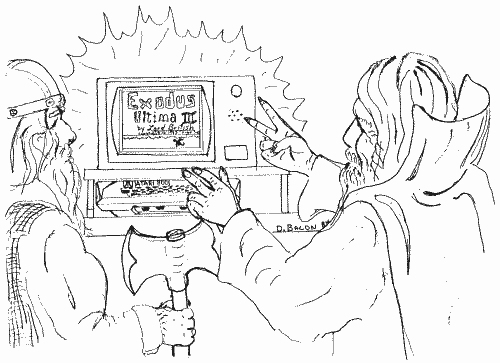 I intend to have an update of Ultima III in the next issue, so in the meantime, any of you fellow Sosarians out there who'd like to see your name in lights, send in your character name, # of moves, level, and of course, your real name(Exceptionally powerful characters might be tempted to include a photograph as proof!!). Also, if any of you should meet Exodus, send in a photo and it will be printed along with your name in the next issue.