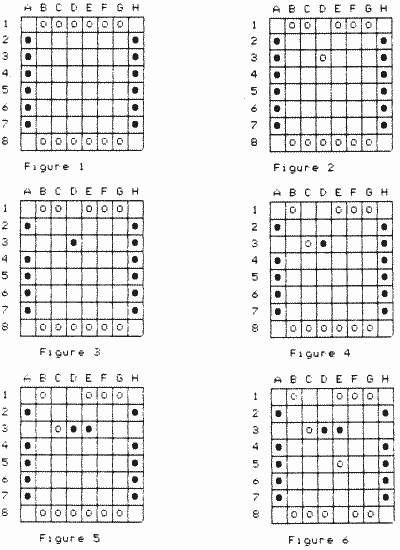 The play of the game is simple. Each person, in turn, moves any man to another spot on the board. The direction that a man can move, and the number of squares that he can move, depends on his position on the board, and on the position of all the other men. A man can move horizontally, vertically, or diagonally the same number of squares as there are men in that direction. Let me explain this further. Looking at Figure 1 again, observe the WHITE man at B2. He can move horizontally, vertically, diagonally right, and diagonally left. In his horizontal row , there are six men. Thus, he can move (in theory) six squares to the left, or six squares to the right in a horizontal manner. There are two men in the vertical column, so he can move two squares up, or two squares down. There are two men in the diagonal left column, so he can move two squares in that direction. There are two men in the diagonal right, so he can move two squares in that direction. During play, you can see all the possible moves of a man, by moving the cursor to that man, and pressing the trigger. These are all possible moves. There are limits to the moves that can be made in the actual game. You cannot move off the board. You cannot move and land on your own man. You can jump over your own men, but you cannot jump over an opponent's man. You can land on your opponent, and he is removed from the board. Otherwise, the moves can be made in any manner.