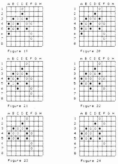 WHITE has changed the flow of the game. White now moves from G2 to E4, taking the BLACK man there. White is now trying to consolidate his men, in Figure 18. BLACK now moves from C2 to D2, and WHITE moves from D1 to El in move 16. In Figure 19, BLACK moves from A6 to C6, to try to get the man at E4. White counters by moving from F7 to C4, removing the BLACK man there. BLACK then moves from C6 to E4, taking WHITE. WHITE moves from F4 to F2. BLACK moves from E4 to F3, to try to take the man at F6, but WHITE does it first in Figure 26. BLACK moves from E5 to C3, taking WHITE there, and leaves himself open for WHITE's E1 to E3 move for the win.