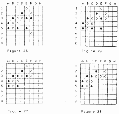 I have gone through a game in a great deal of detail to show the flavor of it. It is very exciting, and contains portions of OTHELLO, checkers, and chess. The interesting part of the game is how each move changes the board for the other men. The major flaw is in Figure 27, where Black is so eager to move to C3 that he removes one man from that column, allowing WHITE a two move vertically, which removed the man. If the man were still at E5, then only a three vertical move would be allowed, and the man at E3 would have been safe.
