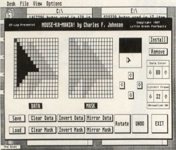 Mouse-Ka-Mania is a mouse editor that can be run from within any GEM program that allows a menu bar; but it also has several capabilities that set it apart from other mouse editors. It lets you replace the system's arrow cursor (you know, the one you see every time you turn on the ST) with any mouse-begotten shape you can dream up. And, it lets you design an animation loop of up to thirty-two frames, which will cycle at any speed.