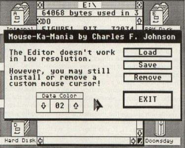The mouse editor part of Mouse-Ka-Mania works in medium or high resolution. However, in low resolution you can still load a custom mouse shape (single-frame or animated) from disk, install or remove it as the default, and adjust its colors.