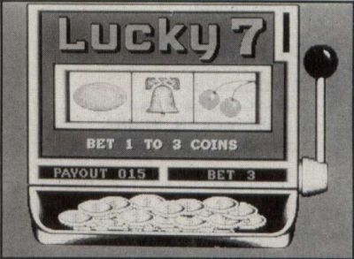 Everyone, whether they have actually played or not, is familiar with slot machines or "One-Armed Bandits" as they're sometimes called. The Video Vegas version, called "Lucky 7," is a realistic simulation of the 3-reel type of machine that squeezes so many dollars from unsuspecting tourists each year. The graphics are superb, but just as important—especially in the case of a slot machine—the sounds have been carefully programmed. This is some of the best use of sound I've heard on the ST. All the way from the sound of the crank being pulled to the clinking of coins falling into the machine's tray when you hit a payoff, the simulation is about as close to the real thing as you could expect from a computer game.