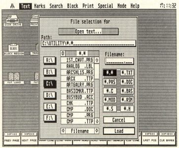 When loading or saving documents, Tempus uses a customized file selector, not the normal GEM item selector that we've all come to know and love/hate. The Tempus file selector has every feature of its GEM counterpart, along with some extra capabilities that make it much easier to use. Drives are selected by clicking on a button, instead of by editing the directory line. Much more information is available about the files displayed; you can show the size and time/date stamp of each file as well as its name. A list of standard filename extensions is provided as well, such as .BAS, .S, .ASM, .C, .PAS, etc.