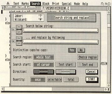 The search routines are very flexible, allowing backward or forward searches with the option to ignore upper/lowercase differences. Up to 20 strings may be entered and remembered by the program for subsequent searches. Searches can be limited to a specified region or include the whole text. Search strings can include wildcards that stand for any character. And did I mention that the search routines are fast? The only deficiency in Tempus' search capabilities is that it can't search for a string of text that extends across more than one line.