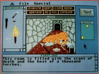 Above the GEM-like windows is a command window that contains eight buttons labeled "Examine," "Open," "Close," "Speak," "Operate," "Go," "Hit" and "Consume." These are all the commands that are necessary to complete the adventure. But don't get the idea that this limited "vocabulary" makes the game easy. The eight commands combined with the large number of onscreen items gives you plenty to think about.