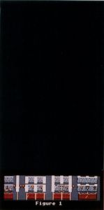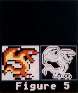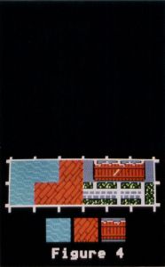 In place of color the artist must use outlines, dithered fill patterns (specific arrangements of black and white dots which create the effect of textures and gray tones). With tile graphics it's often best to try to leave any overlaid objects simple, without complex fills, and use the dithered effects on terrain squares. See Figure 6 for an example of the differences between the same tile in low resolution and monochrome.