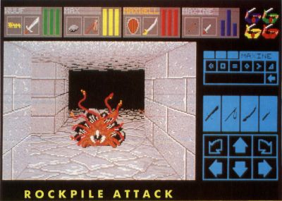 One thing in the dungeon which may not look like a weapon, but which can be immensely useful is the typical, ordinary door. Not only are the doors useful to hide behind while your characters regain their health and magical mana, but they can also be closed on a monster's head (or whatever), causing them damage. Most of the monsters are fast enough, and smart enough, to move out from under the doors after being hit once or twice, but the added damage may be enough to make a difference in killing them. Most of them will also come back for more, so you can stand next to an open door and keep closing it on the monster while you hit it with your weapons and magic. This works extremely well against the slow moving Rockpile Monsters, which can't move out from under the door very quickly. Unfortunately, killing a creature with a door doesn't advance any of your character's skills, but on the other hand, it just might keep them alive.