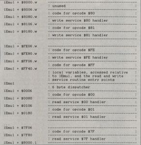 Read and write service handlers are another 256 routines I'll mention soon, but they were able to share memory with the 6502 dispatcher since none of the opcode routines was ever longer than about 80 bytes.