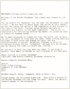As I mentioned, the menus are all designed for maximum simplicity and comfort. To show how easy it is, Figure 2 is a sample session starting from the Merchants' Row menu and continuing on through the listings of the Boston Computer Exchange.