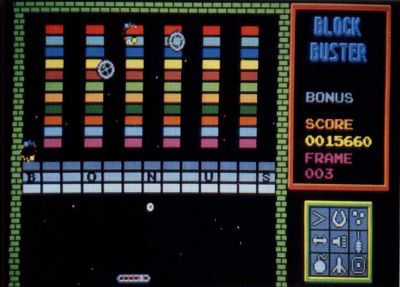Blockbuster (Mindscape) is a compelling update of the classic wall-bashing theme made famous by Atari's Breakout almost a decade ago. Although the coin-op hit Arkanoid obviously inspired Audiogenic Sound Ltd. design, Blockbuster adds several innovations of its own to the genre.