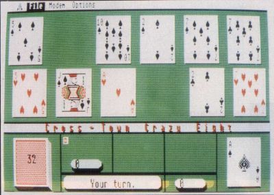 For those who've never played Crazy Eights, it's a game in which players attempt to match pairs. The winner is the first player to get rid of all his or her cards. Author Patrick Dell'Era's computer opponent is one sharp customer, but if human competition is what you're after, Cross-Town Crazy 8 is playable over a modem with opponents across town or around the world.