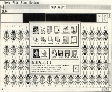 MultiPaint is a desk accessory paint program for the Atari ST. With it, detailed pictures can be created while working alongside other GEM applications that support desk accessories. It can be used to enhance the output of a CAD program or language such as ST BASIC, for example, or to just have fun and doodle while word processing. It is designed to work in color or monochrome, in any screen resolution and is compatible with DEGAS and Neochrome picture files. Functions include draw, point, copy, magnify, fill, text, circle, disc, frame, box, airbrush, palette, lines and rays with many options. A full-screen view is also provided, as well as variable line styles and drawing weights. In addition a "grabber" function is available to grab images directly off of a GEM screen, which can then be manipulated using any available MultiPaint function.