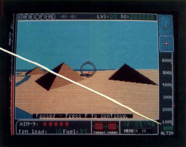 Your first form of attack is your missiles. You have two types: AIM-9 Side Winders, medium range (5 miles) and heat-seeking; and AIM-7 Sparrows, longer range (25 miles) and radar homing. Maneuvering your jet into position, you line up a MIG-23 in your sights. When the MIG gets into range, a targeting computer shows when a missile hit is likely, and you fire. If you want, you can now turn on the camera in the tip of the missile and follow it kamikaze style.