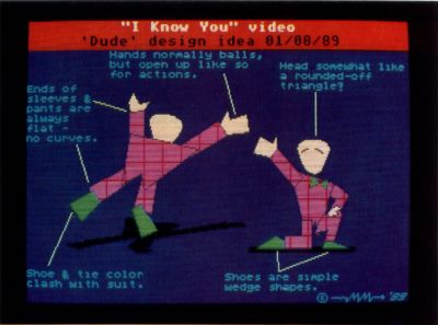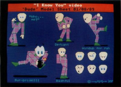 I highly recommend generating test models of your characters on the ST as soon as you have a good idea of what they'll look like. You may find that the resolution and limited colors force you to make changes in your designs. This applies no matter which program you are using. If you're generating 3-D model characters, try building a rough model to see if it looks okay. If using a more conventional paint/animation system, draw it. It's also useful to try to determine your color palette at this point. Normally we've got only 16 colors to play with, and you should endeavor not to waste any. In the case of the man and woman in the music animation, I was careful to draw them with only eight colors. The remaining eight can be changed to suit the needs of a specific shot. To keep this consistent I created a master-palette screen that lists all 16 colors and indicates which are reserved and for what purpose.