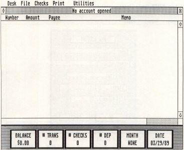 Across the bottom of the screen are six boxes that contain various information about your account. From left to right they are the account balance, the number of transactions, the number of checks and the number of deposits in the currently opened month, the month you're working on and the date. Before an account is opened, most of these boxes will contain zeroes.