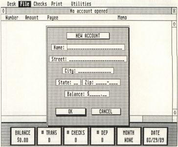To create an account, select New from the File drop-down menu or press Control-N. A dialog box will appear, prompting you for the personal information the program requires. Fill in your name and address and the starting balance for your account.