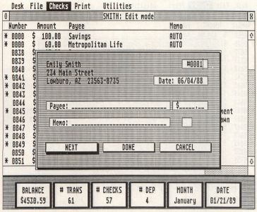 When all of the information for a check has been entered, you must click one of the buttons along the bottom of the check form—or simply press Return to enter the current check and set up the form for the next. Clicking on the NEXT button has the same effect as pressing Return. Clicking on the DONE button enters the current check, then closes the check-entry form. Clicking on CANCEL closes the checkentry form without entering the current check.