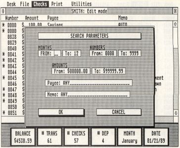 Figure 6If you need to locate a check or group of checks, you can use Microcheck ST's search feature. To access this function, click on the Search option of the Checks drop-down menu or press Control-S. The search parameter-entry form will appear.