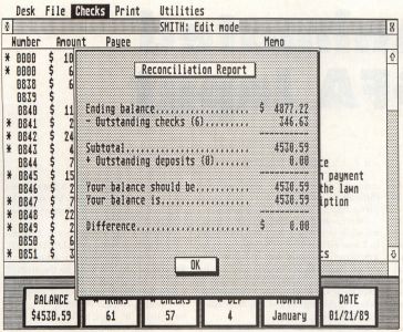 Click on the Reconcile entry of the Checks dropdown menu or press Control-R on your keyboard. A dialog box will appear, requesting your account's ending balance as shown on your bank statement. Once you've entered this amount, press Return, and MicroCheck ST will read through all your check files and, after making the appropriate calculations, display a final report.