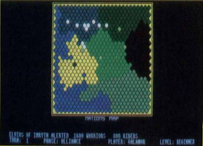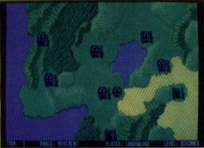 The game is broken down into turns, and the turns into phases. Each turn represents one day. (Remember that; I'll be getting back to it.) The phases are Shadowlord Movement, Shadowlord Combat, Galanor Alliance, Galanor Movement and Galanor Combat. The Alliance phase is when reinforcements appear and when various Galanor armies are alerted. Only one scenario is offered, and the single option available to diversify the game is the choice of beginner, advanced and expert difficulty levels. The game ends after 40 turns (at the beginner difficulty level), when all the forces of one side have been eliminated or when one side's citadel has been captured.
