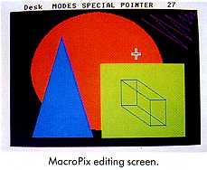 Unfortunately, whereas paint pictures slap themselves quickly to the screen at the speed of a memory move, MacroPix has to go through and redraw each command. Depending upon the complexity of the picture, this will usually take more time than a paint file. The screen redraw, however can be used to your advantage: You can take the redraw into account and create simple animations. Although paint program boo-boos may be painted over leaving no one the wiser, draw over a mistake in MacroPix and it will briefly rear its ugly head during each redraw. But take heart. I have added an editing feature to MacroPix to take care of just this problem.