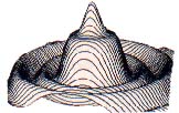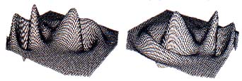 | Figure 8 (A and B). Z =2*(2 ^ (-((X-.5) ^ 2+(Y-1) ^ 2))-2.5 ^ (-((X+2) ^ 2+ (Y+1) ^ 2)))*COS(R); grid scale = 0.10; 32 grid lines per positive axis. This function basically superimposes two hills (the exponential functions) on a cosine curve symmetric about the origin. Two views are shown. |