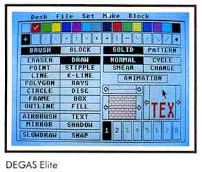 DEGAS Elite features freehand lines, points, K-lines, rays, boxes and circles, all with user-definable brushes. lt also has an airbrush with multiple flow and dispersion settings, ten different magnify windows, mirror effects and shadow. Its text features include a separate font editor with which you can create new fonts or even foreign character sets. And, like NEOchrome, it includes a slideshow program.