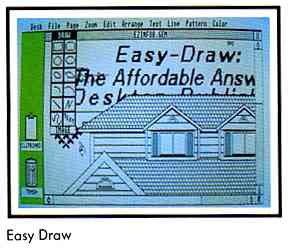 Easy Draw starts you off with an ample toolbox, containing items for freehand drawing, geometric shapes and text. As each object drawn exists on its own "sheet," or layer, whole drawings are made of composites of one or more sheets. The approximate maximum number of objects (layers) per drawing depends on memory size: 4,000 with 512K; 12,000 with one megabyte. You can make the layers transparent or opaque, and can edit them as needed -you can modify or delete any layer As regular paint programs, Easy Draw treats layers as blocks which can be copied, flipped, and stretched. Easy Draw also offers two drawing windows and a clipboard for transferring and storing ideas.