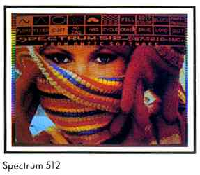 One of Spectrum's most impressive features is Gradient Fill. With it, you can define two (or more) colors in a particular area and have the program interpolate a literal "spectrum" of hues between them-going from deep navy blue to sky-blue, magenta, then brilliant red. (Editor's note: An example of the Gradient Fill function appeared as the background to the cover of the START Buyer's Guide.) The only drawback to Gradient Fill is that it takes some experimentation and practice to control the effect.