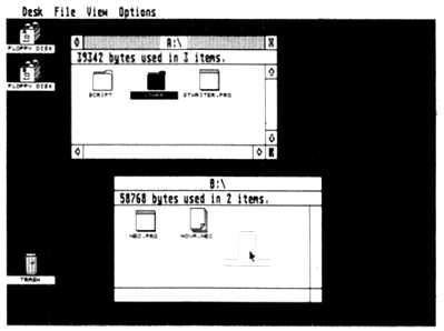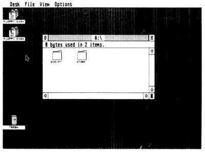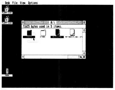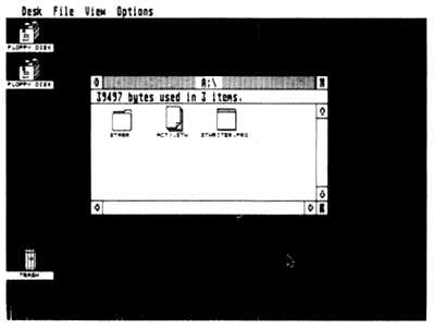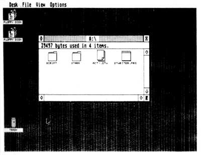 On the ST Desktop, disk icons look like what they act like: filing cabinet drawers. When you open a disk icon and display its directory window, you can see the names of the files on the disk.