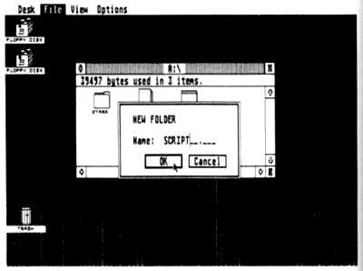 Create a folder by dropping down the File menu and pointing and clicking on the New Folder option. In the dialog box that appears, type in a name for the folder using eight or fewer characters. (You can also add a three-character extension, though it's not necessary.) Then click on OK. The new folder filename will show up in your active directory window. (Folders always appear first in the directory, before any files.)