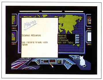 You issue all your orders from your command post, via your control panel. Selecting an option is as simple as clicking on it with the mouse. The first thing to worry about is incoming memos detailing the actions taken by a given nation. You must indicate whether you approve or disapprove of this action or you can ignore it. Your responses to memos tell the nations a lot about you (and your ability to rule the world), so weigh your options carefully.